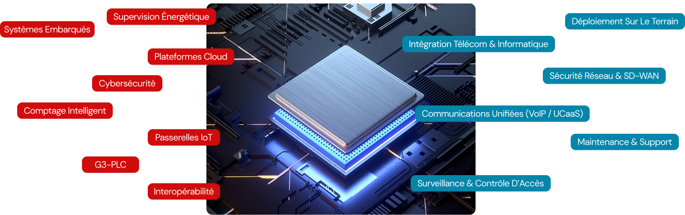 - Intégration Télécoms & IT : déploiement de solutions VoIP, visioconférence, réseaux d’entreprise sécurisés, vidéosurveillance et infrastructure unifiée pour les opérateurs et les entreprises.